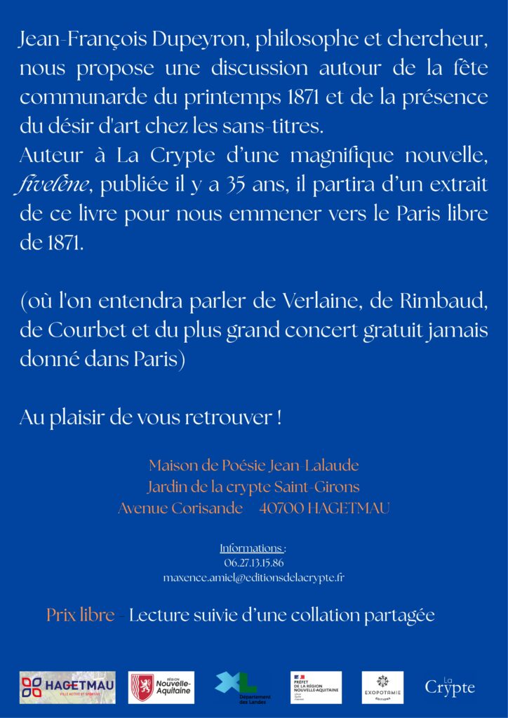 La maison de poésie Jean Lalaude accueillera le chercheur et philosophe Jean-François DUPEYRON le samedi 14 février à 19 h 30.
