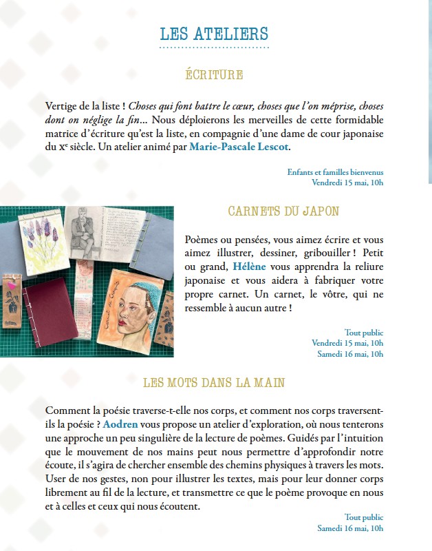 - Carnets du Japon (vendredi 15 et samedi 16, à 10 h) : un atelier animé par Hélène Surget