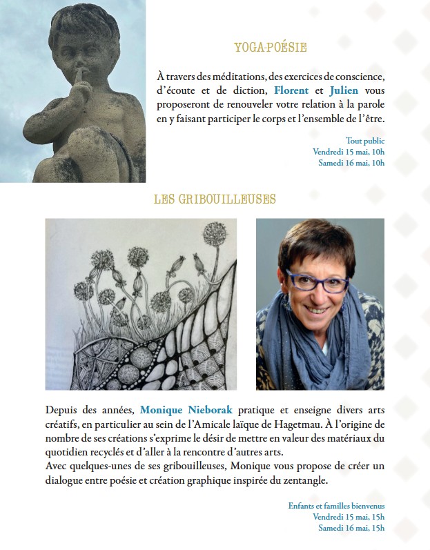 - Yoga-Poésie (vendredi 15 et samedi 16, à partir de 10 h) : un atelier animé par Julien Rousset et Florent Dumontier