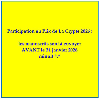 Né à l'initiative de Pierre Seghers (éditeur et poète), Marcel Saint-Martin (peintre et poète), Marie-Louise Haumont (romancière, prix Femina) et Jean Lalaude (professeur agrégé), le prix de La Crypte a vu le jour en 1984. Soutenu par la ville de Hagetmau et le conseil départemental des Landes, le prix de la Crypte récompense un·e jeune poète·sse francophone de moins de 30 ans, qui n'a jamais été publié·e par un éditeur professionnel, que … En savoir plus
